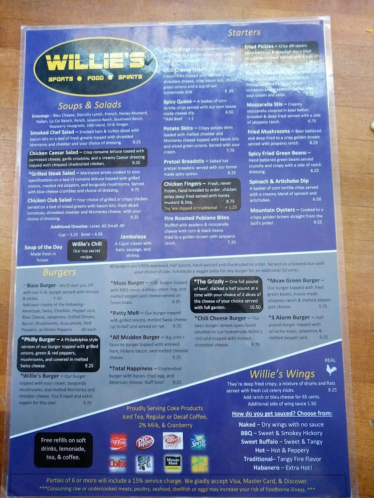 Willie's offers a diverse menu featuring classic American fare. Starting with appetizers like fried okra and spicy queso, there's something for everyone. Main dishes include hearty burgers, chicken strips, and delicious sandwiches like the Reuben. Don't miss the chili and loaded fries for sharing. Daily specials ensure a nice variety, and vegetarian options are available. Desserts like chocolate cake cap a meal perfectly. Willie's menu caters to different tastes while ensuring quality at an affordable price.